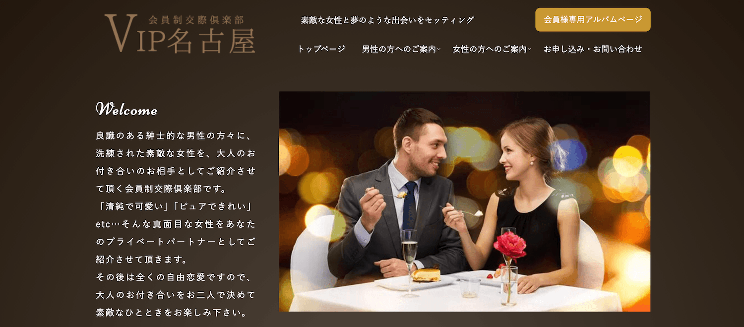 VIP名古屋は、名古屋エリアの富裕層男性と出会える地域密着型の交際クラブです。名古屋の地元の経営者や自営業の男性が多く登録しています。