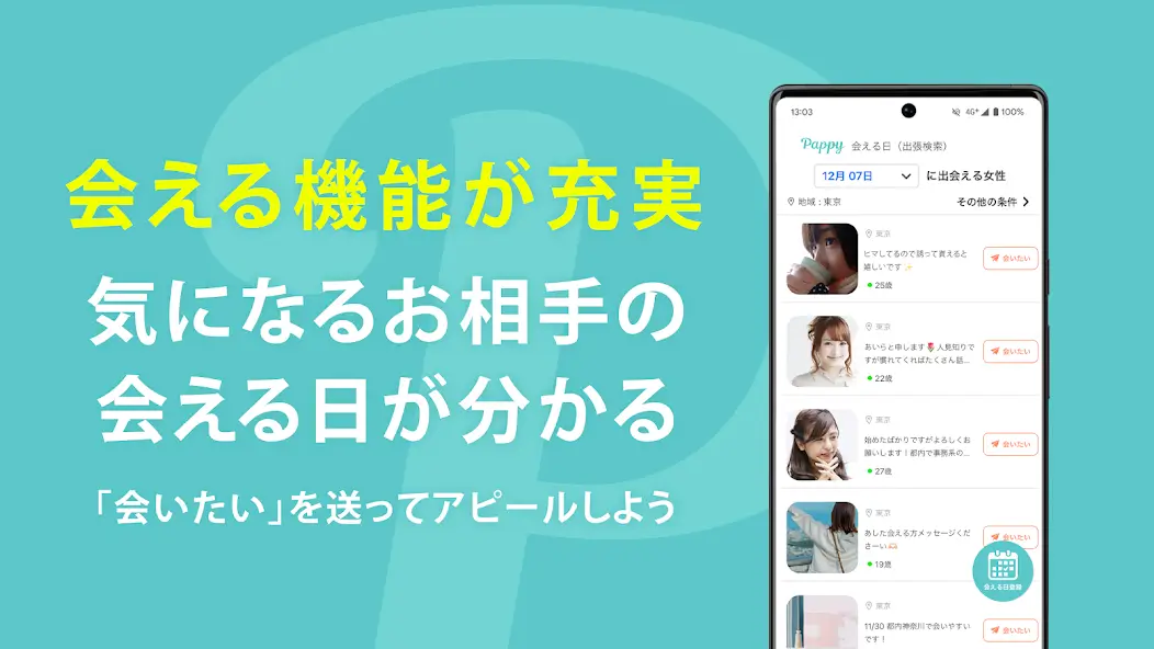 圧倒的な会員数で都会でも地方でもすぐにパパが見つかることに加えて、「今すぐデート機能」で募集することで、たった数分で条件の良いパパと出会うことができます。