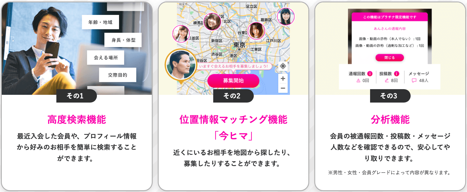 また、直近入会したばかりの人や職業・年収等で太パパを検索できる「高度検索機能」、過去の通報回数やメッセージ人数を見れる「分析機能」など、パパ活を助ける機能が盛りだくさんです。